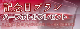 期間:2026年3月31日まで「記念日プラン」(ハーフボトルプレゼント)好評につき延長いたしました。