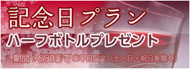 期間:2026年6月30日まで「記念日プラン」(ハーフボトルプレゼント)好評につき延長いたしました。